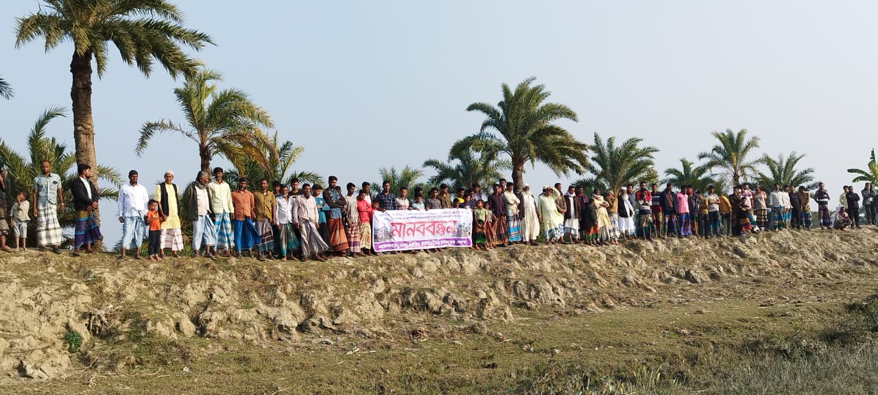 মানববন্ধনে বক্তারা বলেন, গত ৩০ বছর ধরে এই গ্রামটিতে নদী ভাঙ্গন অব্যাহত আছে। আগে ভাঙ্গনের গতি কম থাকলেও এখন অনেক বেড়েছে। মাঝ নদীতে ডুবো চর জেগে উঠায় এখানে ভাঙ্গনের তীব্রতা বৃদ্ধি পেয়েছে।