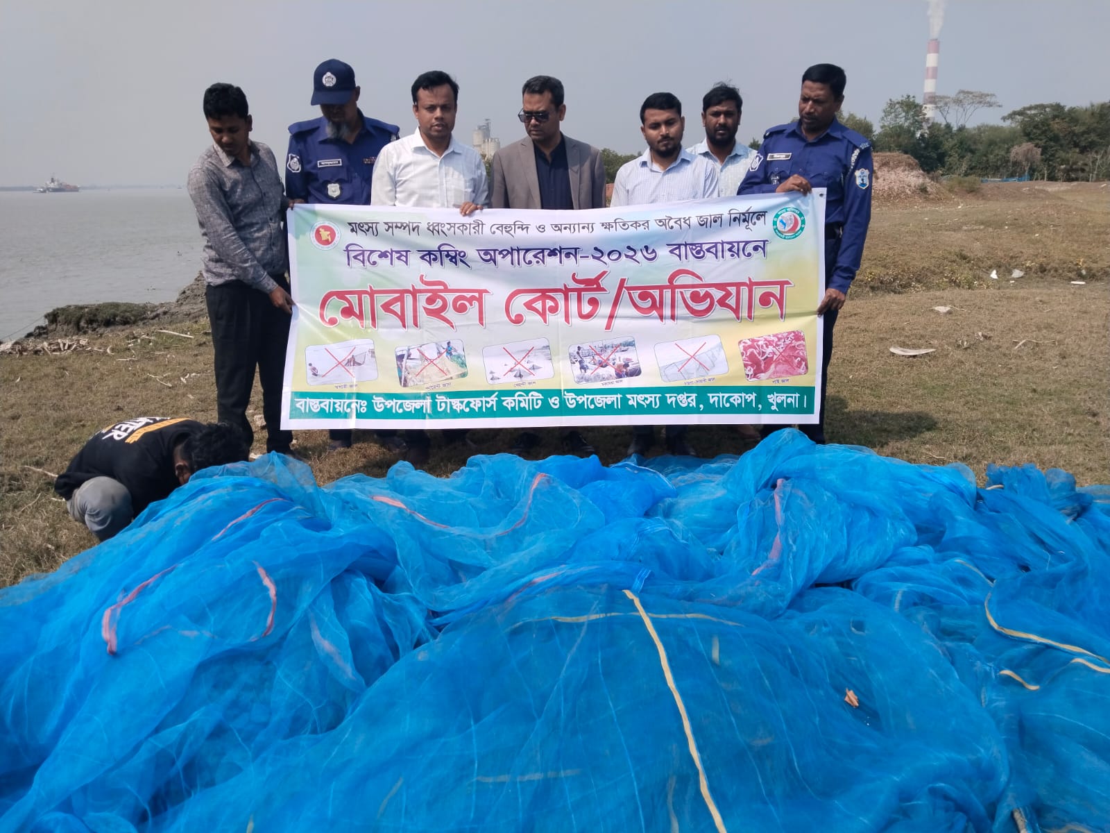 অভিযান চলাকালে দাকোপ উপজেলার পশুর, শিবসা, ভদ্রা, ঢাকি, চনকুড়ি ও ঝপঝপিয়া নদীসহ বিভিন্ন নদ-নদী, খাল ও বিল এলাকায় অবৈধ জালের বিরুদ্ধে কঠোর ব্যবস্থা গ্রহণ করা হয়। চার ধাপে পরিচালিত অভিযানের সময়সূচি ছিল—১ম ধাপ: ০১–০৭ জানুয়ারি ২০২৬- ২য় ধাপ: ১৬–২৩ জানুয়ারি ২০২৬ -৩য় ধাপ: ৩১ জানুয়ারি–০৬ ফেব্রুয়ারি ২০২৬-৪র্থ ধাপ: ১৬–২৩ ফেব্রুয়ারি ২০২৬ এই সময়ে মোট ১১টি মোবাইল কোর্ট ও ৩০টি বিশেষ অভিযান পরিচালিত হয়। অভিযানে নদী ও খাল থেকে উদ্ধার করা হয় প্রায় ৬.০৯ লক্ষ মিটার কারেন্ট জাল, ৫৮টি বেহুন্দি জাল, বিপুল পরিমাণ চরপাটা জাল, চরঘেরা জাল, মশারি জাল ও অন্যান্য অবৈধ জাল (প্রায় ১৪৩ টি)। জব্দকৃত এসব জাল তাৎক্ষণিকভাবে আগুনে পুড়িয়ে বিনষ্ট করা হয়।