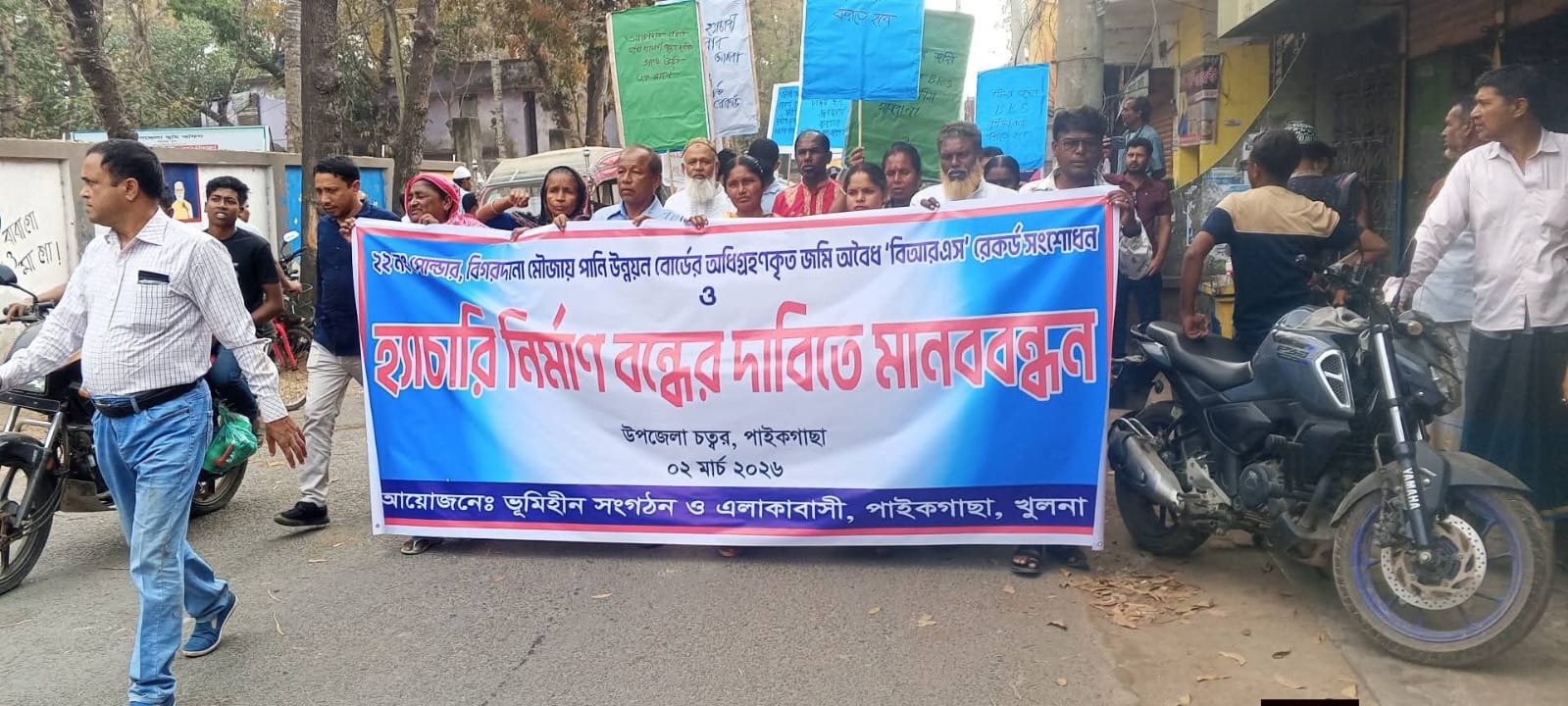 খুলনার পাইকগাছায় অধিগ্রহণকৃত পানি উন্নয়ন বোর্ডের (পাউবো) জমি দখল করে অবৈধভাবে হ্যাচারি নির্মাণের প্রতিবাদে উত্তাল হয়ে উঠেছে স্থানীয় জনপদ। এই নির্মাণকাজ বন্ধের দাবিতে ২ মার্চ রবিবার সকালে উপজেলা চত্বরে বিশাল মানববন্ধন ও বিক্ষোভ কর্মসূচি পালন করেছে স্থানীয় ভূমিহীন সংগঠন ও এলাকাবাসী।