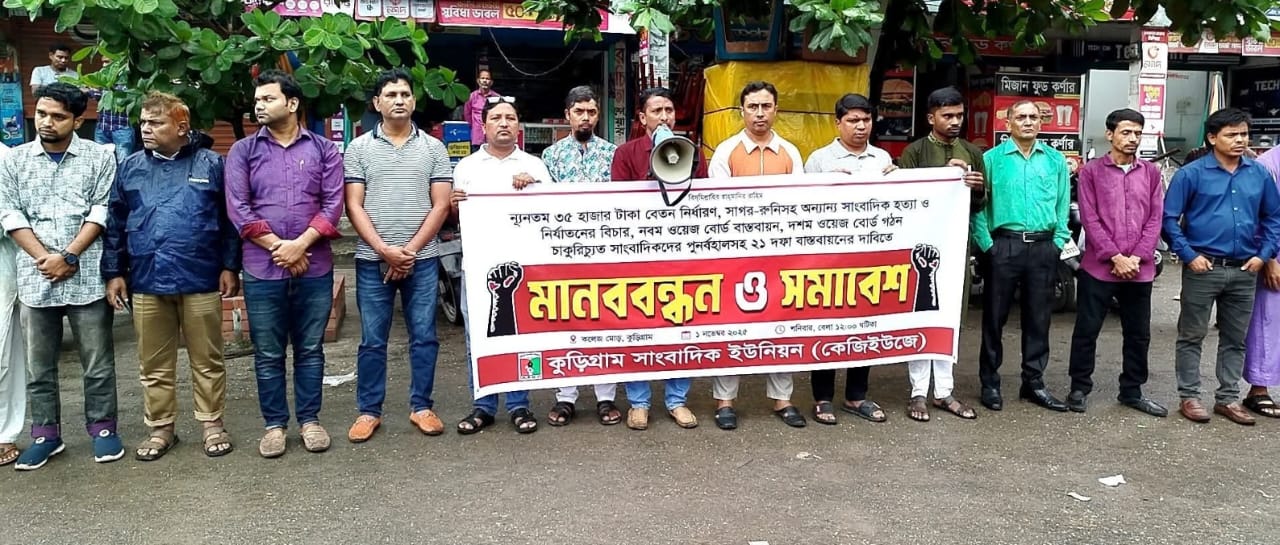 কুড়িগ্রামে ২১ দফা দাবিতে সাংবাদিকদের মানববন্ধন ও সমাবেশ। ন্যুনতম ৩৫ হাজার টাকা বেতন, সাগর-রুনিসহ সকল সাংবাদিকদের হত্যার বিচার, নবম ওয়েজ বোর্ড বাস্তবায়ন, দশম ওয়েজ বোর্ড গঠন, চাকরিচ্যুত সাংবাদিকদের পুনঃবহালসহ ২১ দফা দাবিতে মানববন্ধন ও সমাবেশ করেছে কুড়িগ্রাম সাংবাদিক ইউনিয়ন (কেজিইউজে)।