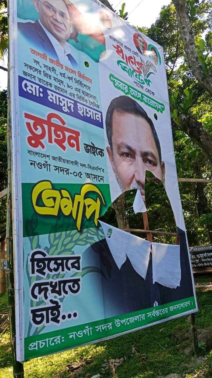 জানা গেছে, নওগাঁ শহর ও বিভিন্ন ইউনিয়নে স্থাপিত বিলবোর্ডে জিয়াউর রহমান, খালেদা জিয়া, তারেক রহমানের ছবির সঙ্গে মাসুদ হাসান তুহিনের ছবিযুক্ত ব্যানার লাগানো ছিল। অভিযোগ অনুযায়ী, রাতের আঁধারে দুর্বৃত্তরা বিলবোর্ডে উঠে এসব ব্যানার ছিঁড়ে ফেলে।