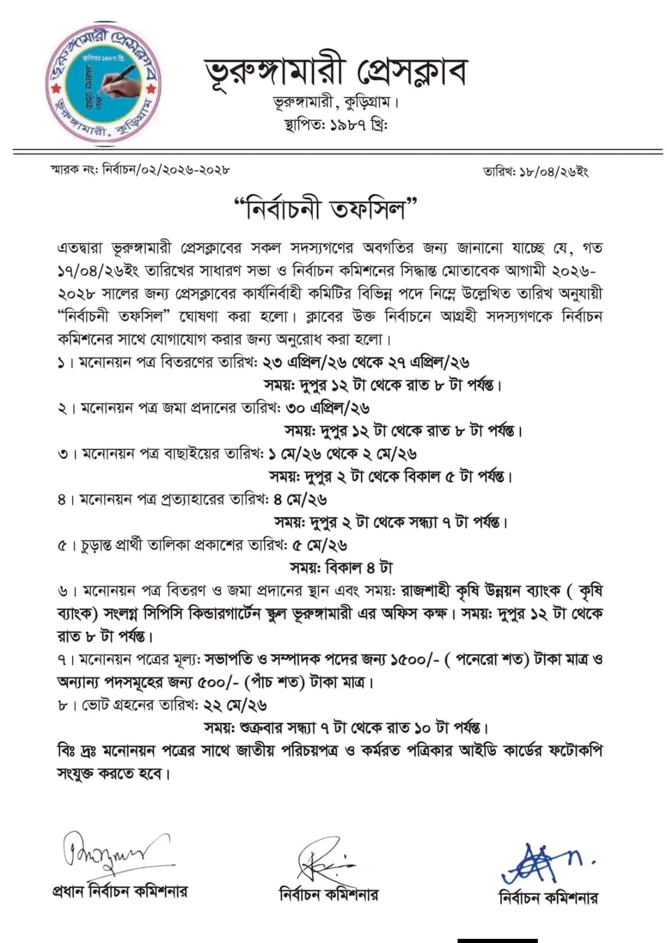 ভুরুঙ্গামারী প্রেসক্লাব নির্বাচনের তফসিল ঘোষণা: ভোট গ্রহণ ২২ মে