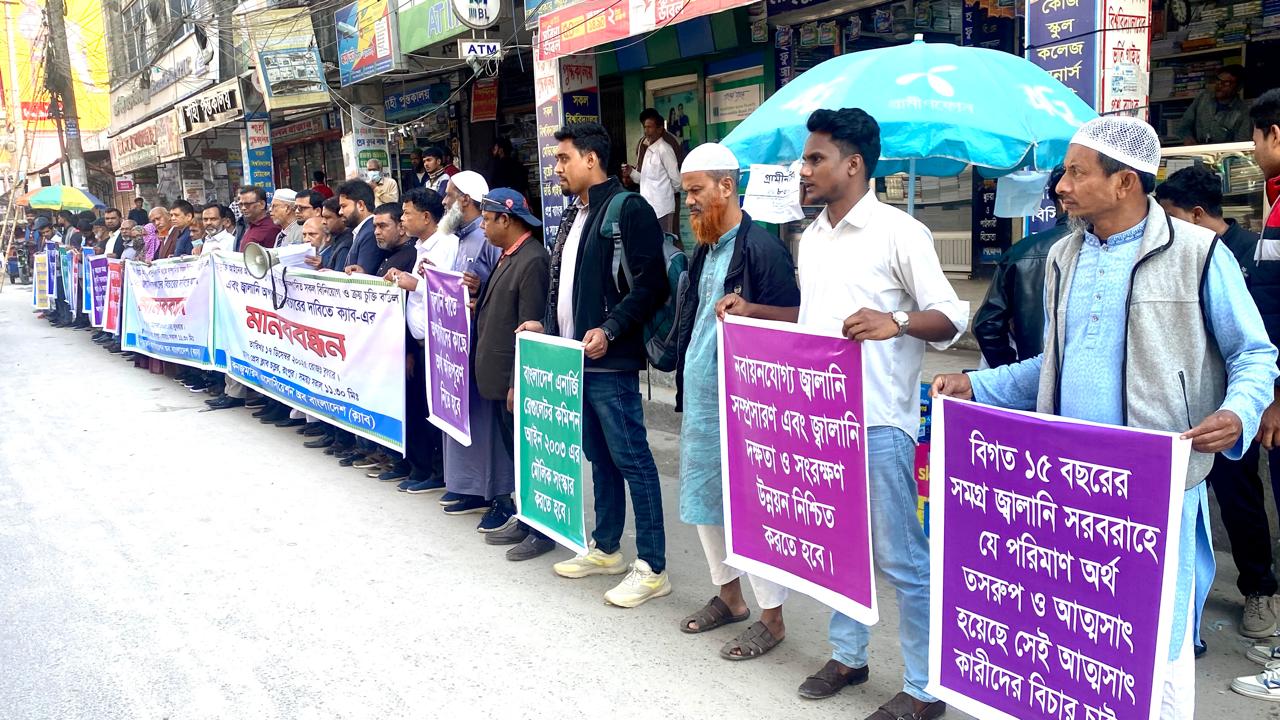 দায়মুক্তি আইনের আওতায় বিদ্যুৎ ও জ্বালানি খাতে সম্পাদিত সব বিনিয়োগ ও ক্রয় চুক্তি বাতিল এবং জ্বালানি অপরাধিদের বিচারের দাবিতে মানববন্ধনে ক্যাব-এর ৯ দফা দাবি সমূহ